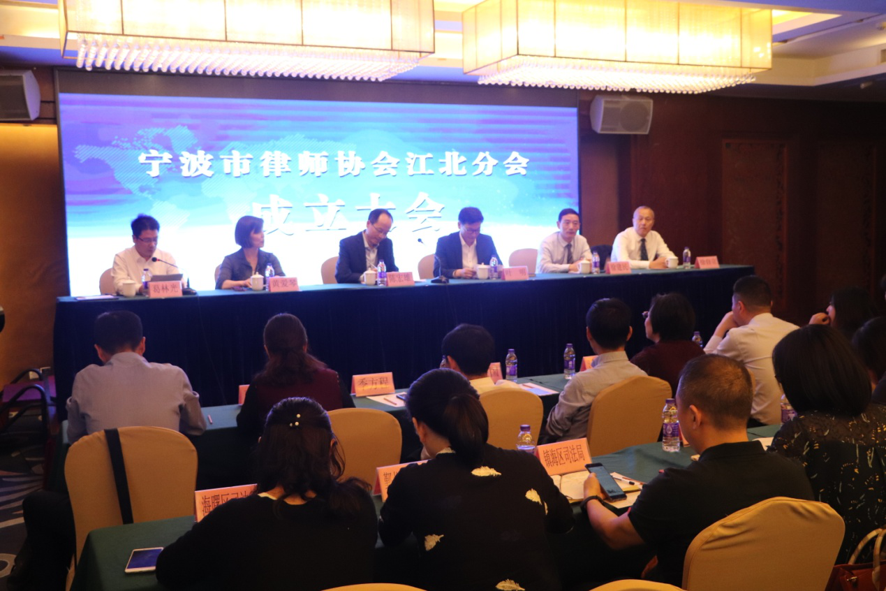 2019年5月9日下午,宁波市律师协会江北分会成立大会在宁波金港大酒店举行。江北分会是宁波市律协成立的第五个分会。江北区政府党组成员陈宏雄,区相关部门负责人,区司法局及各司法所负责人,辖区内各律所主任及律师代表,宁波市司法局律管处负责人黄爱琴,副处长曹怡、吴存波,各区县市司法局代表,市律协会长叶明、监事长徐建民及各分会会长等共80余人参加了成立大会,会议由江北区司法局副局长葛林光主持。