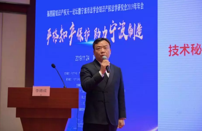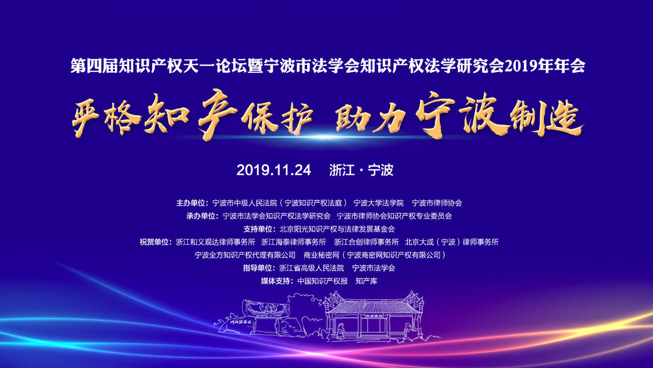 2019年11月24日上午,为积极贯彻落实中共中央办公厅、国务院办公厅《关于强化知识产权保护的意见》,以及市委市政府“六争攻坚三年攀高”的决策部署,由宁波市中级人民法院、宁波大学法学院、宁波市律师协会联合主办的第四届知识产权天一论坛暨宁波市法学会知识产权法学研究会2019年年会在宁波开元名都大酒店成功举办。