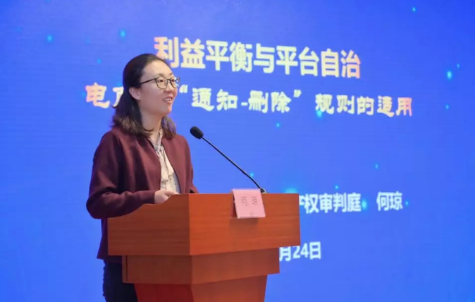 随后,由浙江高院知产庭审判长、综合组组长何琼法官作《电商法“通知——删除”规则的适用》的分享。